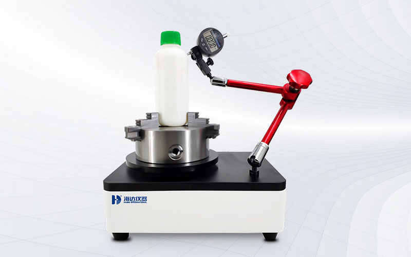 將瓶底加持固定在水平板的旋轉盤上,使瓶口與千分表接觸,旋轉360°讀取最大值和最小值,二者之差的1/2即為垂直軸偏差數值。儀器利用四爪自定心卡盤同心度高的特點,配合一套可以自由調節高度和方位的高自由度的支架,可以滿足各類玻璃瓶及塑料瓶檢測。